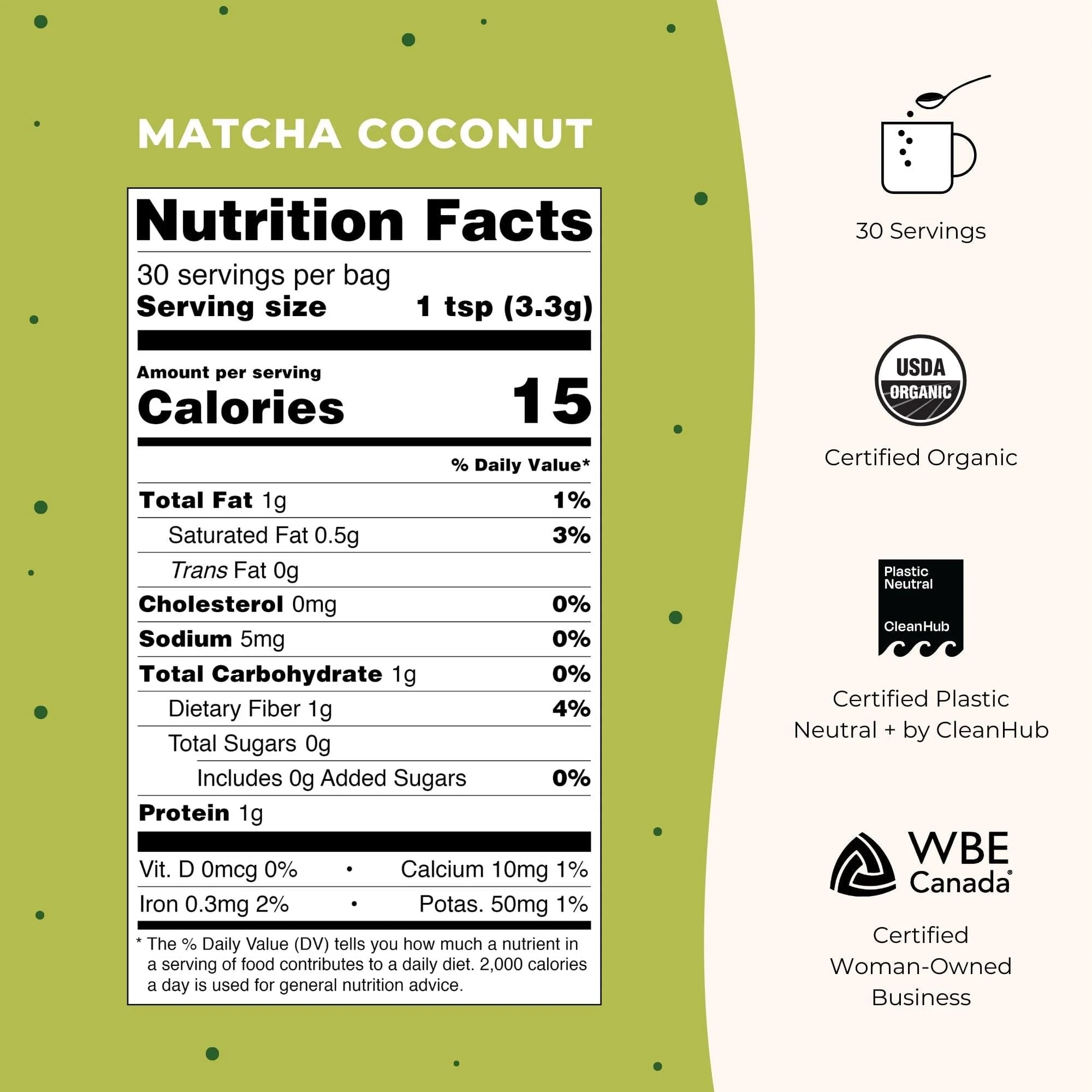 Ingredients: Organic Matcha Powder, Organic Coconut Milk Powder (organic coconut milk, organic tapioca maltodextrin), Organic Moringa Leaf Powder. Contains: Coconut