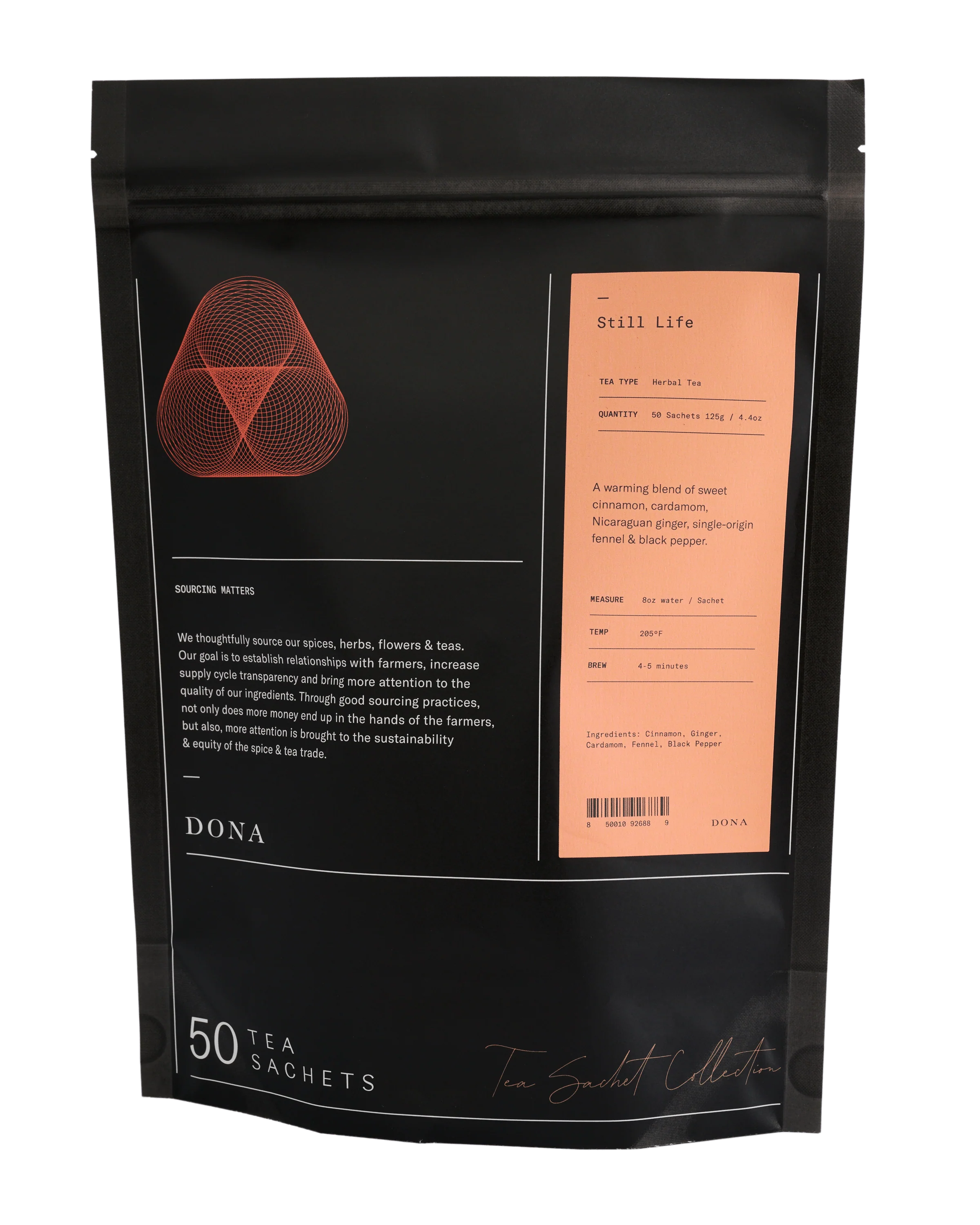 Our take on caffeine-free Masala Chai: A warming blend of sweet cinnamon, cardamom, Nicaraguan ginger, single-origin fennel & black pepper